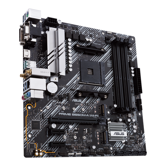 ASUS PRIME B550M-A WiFi II DDR4 AMD B550 (Ryzen AM4) micro ATX motherboard with dual M.2, PCIe 4.0, Intel® WiFi 6, 1 Gb Ethernet, HDMI/D-Sub/DVI, SATA 6 Gbps, USB 3.2 Gen 2 Type-A, and Aura Sync RGB headers support