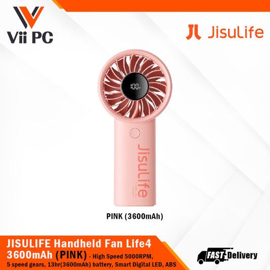 JISULIFE Handheld Fan Life4 3600mAh/5000mAh (Pink/Light Grey/Black) speed upto 5000RP, 5 speed gears, ABS material, 1 Year Wty