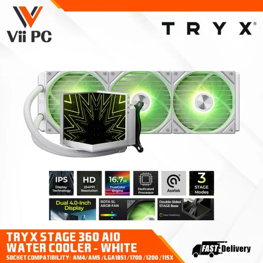 TRYX STAGE 360 AIO BLACK OW WHITE DUAL 4.0 INCH IPS DISPLAY SUPPORT INTEL AND AMD 360MM ARGB WATER LIQUID COLLER