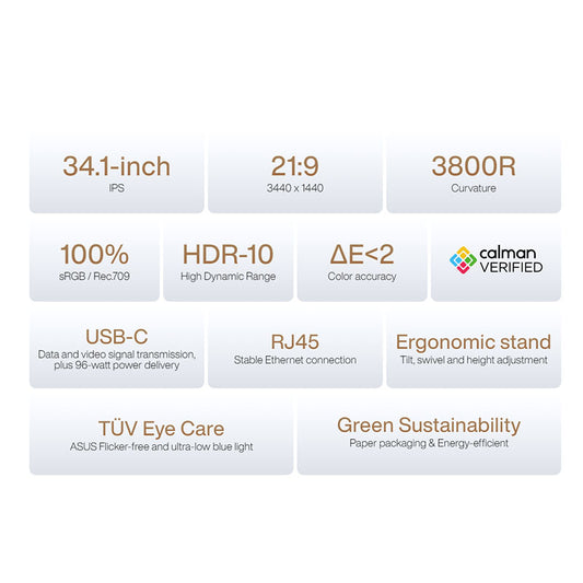 ASUS ProArt Display PA34VCNV Curved Professional Monitor - 34.1" IPS, 21:9 (3440x1440), 3800R Curvature, 100% sRGB / Rec.709, Color Accuracy ΔE<2, Calman Verified, USB-C Docking PD 96W, RJ45