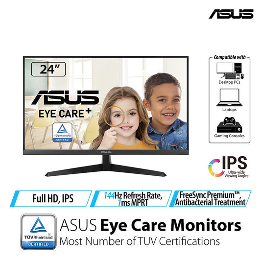 ASUS VY279HGE Eye Care Gaming Monitor – 27" FHD (1920x1080) IPS, 144Hz, SmoothMotion, 1ms (MPRT), FreeSync Premium™, Eye Care Plus technology, Blue Light Filter, Flicker Free, antibacterial treatment