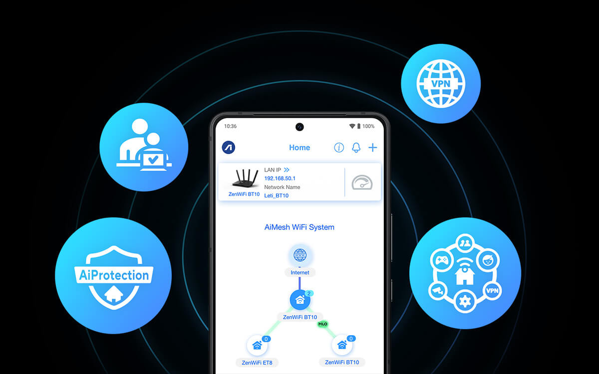 In the age of AI, reliable connectivity is crucial. With an ASUS WiFi 7 router or mesh WiFi system at the heart of your AI network, you can enjoy up to 2.4X faster speeds with extremely low latency, while commercial-grade end-to-end network security safeguards every device and connection within your extendable AiMesh network. Extreme wired capacity — up to 34 G with dual 10 G Ethernet ports — empowers you to build a robust local AI network with top-notch privacy and security. Additionally, comprehensive network management tools and VPN features let you harness the full potential of a connected world.