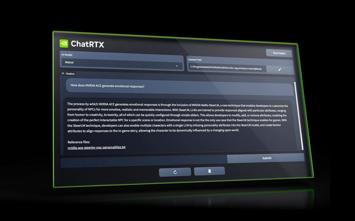 Build your own large language model (LLM) using your locally stored files with NVIDIA ChatRTX. Search your personal notes, files, and photos with text or voice input and receive tailored responses from your custom, private chatbot.