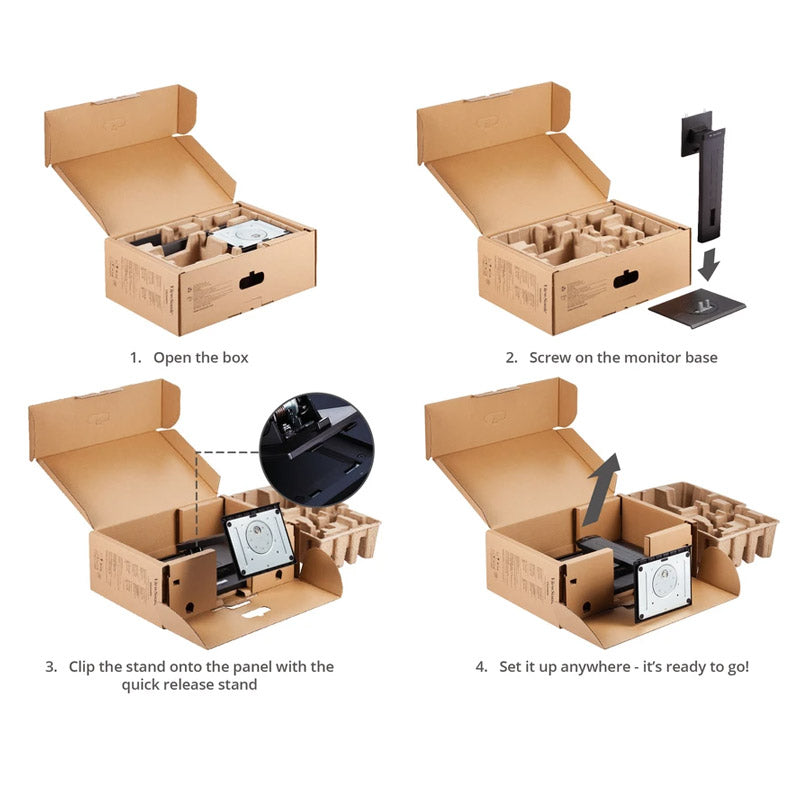 Instant assembly with no expertise required. Simply open the box, screw the base to the quick release stand, snap the stand into place using the slots, and lift the fully assembled display out the box.- Quick Release Stand