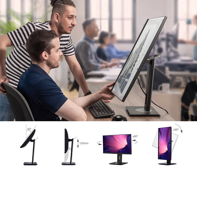 The monitor includes an ergonomic stand, which allows you to easily tilt up to 40-degrees, swivel your monitor to an ideal position, adjust the height and rotate the monitor 90 degrees for portrait viewing, making it a good fit whether used on your own or during group discussion and screen sharing.