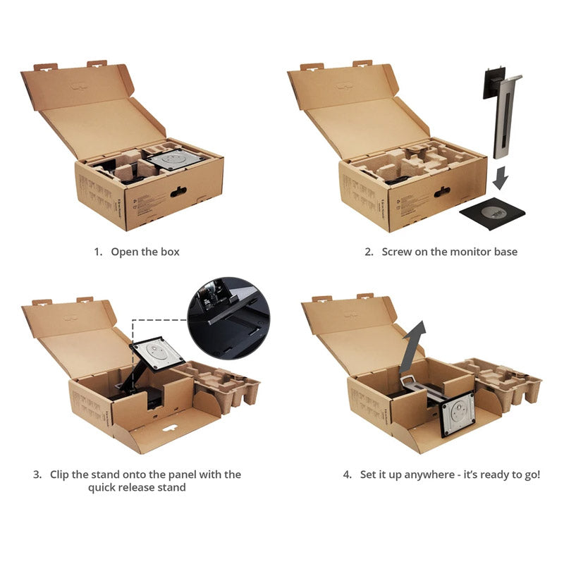 Only a few steps away from your docking monitor: simply open the green box, screw the base onto the quick release stand, snap the stand into place using the slots, and lift it up - it’s done.