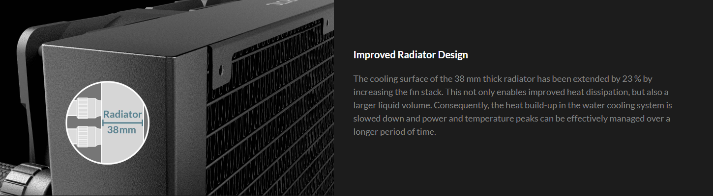 • Improved Radiator Design (38 mm thick radiator has been extended by 23 % by increasing the fin stack)