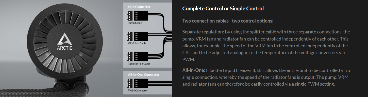 • Complete Control or Simple Control (Two connection cables - two control options: Separate regulation and All-in-One)