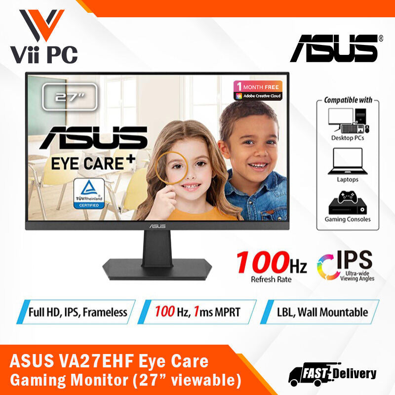 ASUS VA27EHF Eye Care Gaming Monitor - 27" IPS, FHD, Frameless, 100Hz, Adaptive-Sync, 1ms MPRT, HDMI, Low Blue Light, Flicker Free, Wall Mountable