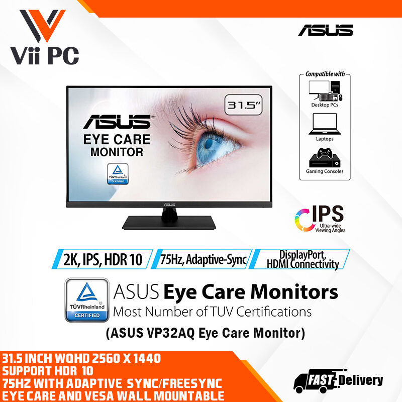 ASUS VP32AQ Eye Care monitor features 31.5-inch WQHD (2560 x 1440) with IPS 178° wide-viewing-angle, it delivers sharp, detail and immersive viewing experience. 100% sRGB provides realistic colors and smoother gradation. To achieves seamlessly smooth gameplay, VP32AQ with Adaptive-Sync/FreeSync™ technology to eliminate screen tearing and enhances image details in dark areas. In addition, ASUS Eye Care technology ensures a comfortable viewing experience.
