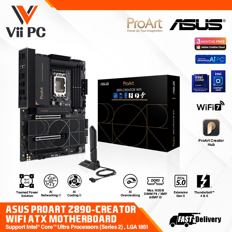 The ASUS ProArt Z890 Creator WiFi Motherboard is engineered for creators and professionals seeking top-tier performance, reliability, and connectivity. Powered by Intel Core Ultra processors (Series 2) and the LGA1851 socket, it supports PCIe 5.0 and dual Thunderbolt 4 ports, providing lightning-fast data transfer and next-gen GPU compatibility. With support for 4x DDR5 DIMM slots and 5x M.2 slots for ultra-fast storage, 4x SATA 6Gb/s ports, 10x rear USB ports including Thunderbolt 5 Type-C, 5x front USB ports, Marvell AQtion 10Gb Ethernet, with WiFi 7 and Bluetooth 5.4, this motherboard ensures seamless connectivity and optimal network performance. Its advanced cooling solutions, robust power delivery, and exclusive ProArt features like Creator Hub make it perfect for demanding creative workflows, offering stability and efficiency for content creation, video editing, and 3D rendering, in a ATX form factor.