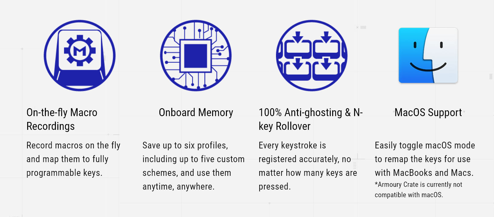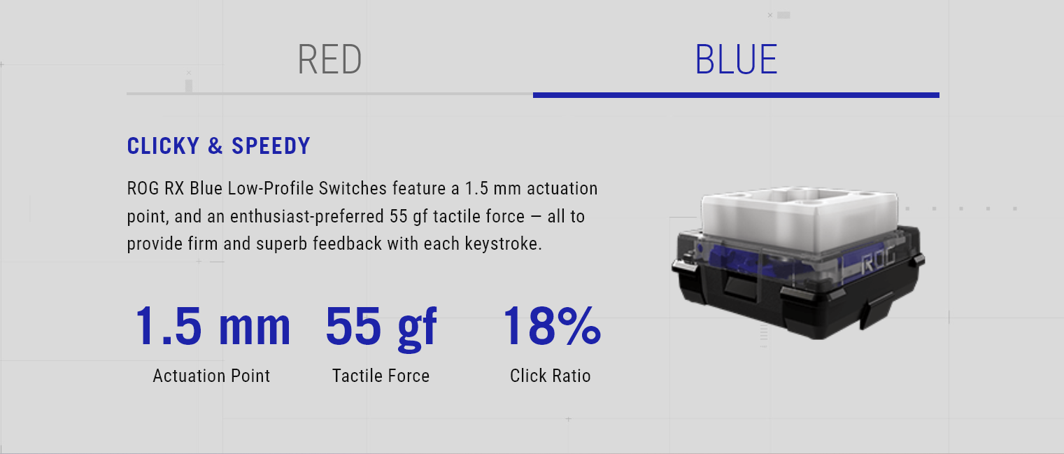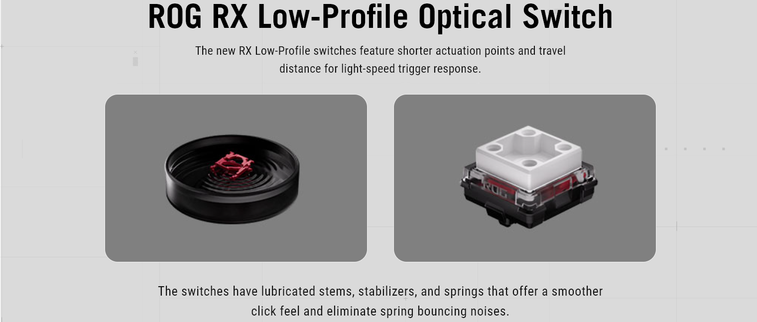 ROG RX Low-Profile Optical Switches : Pre-lubed RX Red and Blue switches feature centralized lighting and provide consistent wobble-free keystrokes with near-zero debounce delay
