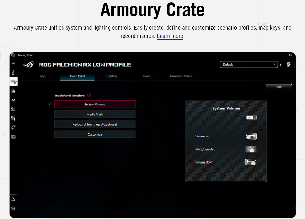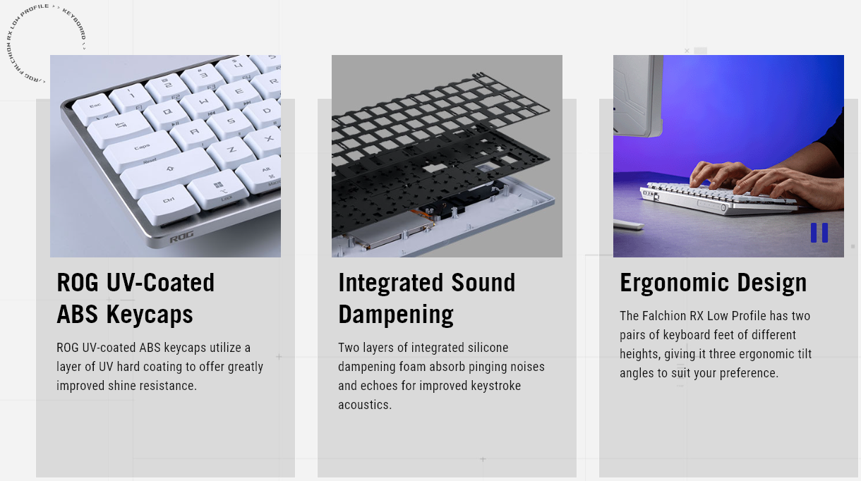 Compact & Slim : Measuring just 306 mm in length, ROG Falchion RX Low Profile masterfully incorporates a 65% layout into a 60% frame. Its 26.5 mm slim profile and compact dimensions free up desktop space for your mousing hand.