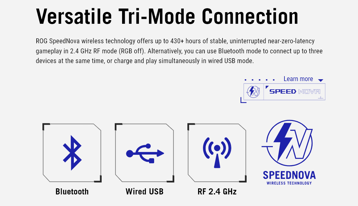 Tri-mode connection : Connect via Bluetooth (up to three devices simultaneously), 2.4GHz with ROG Speed Nova wireless technology, or wired USB