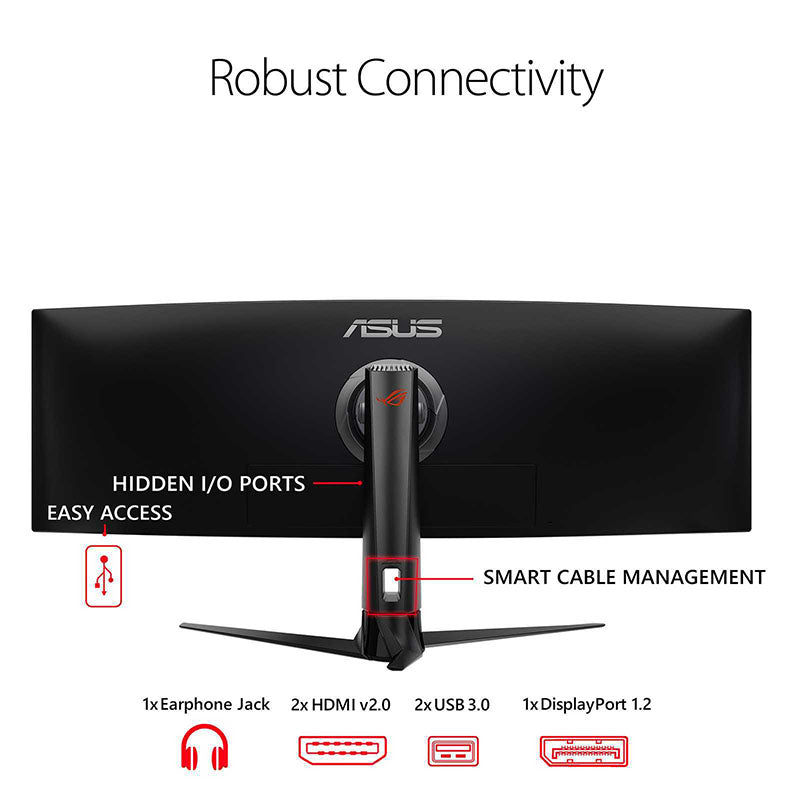 The 49-inch ROG Strix XG49VQ gaming monitor with 1800R curvature delivers the ultimate immersive gaming experience and extra flexibility for multitasking. With a 32:9 aspect ratio, the super ultra-wide display provides the same viewing area as two side-by-side 27-inch monitors without a gap and bezel getting in the way of your view.