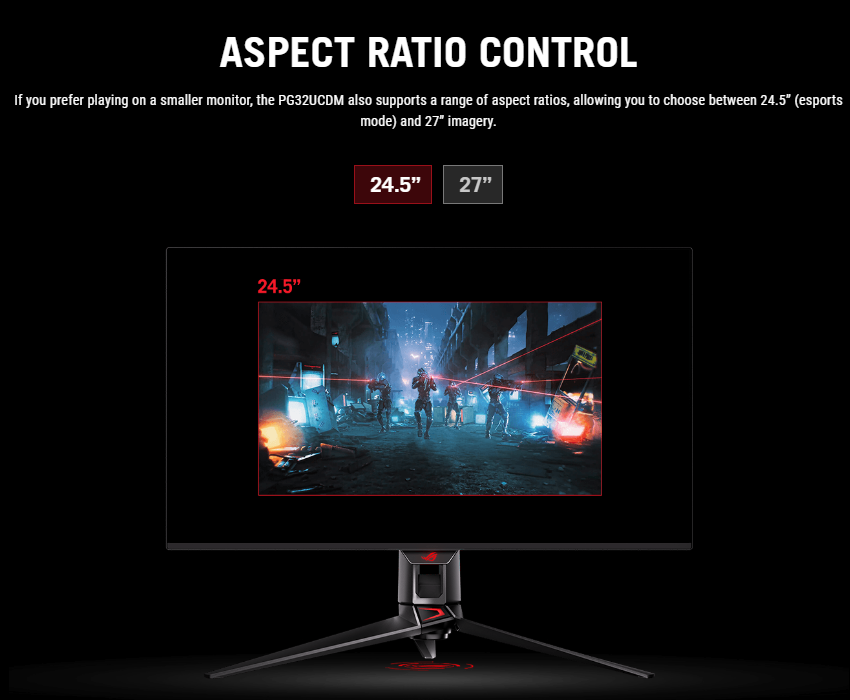 If you prefer playing on a smaller monitor, the PG32UCDM also supports a range of aspect ratios, allowing you to choose between 24.5” (esports mode) and 27” imagery.