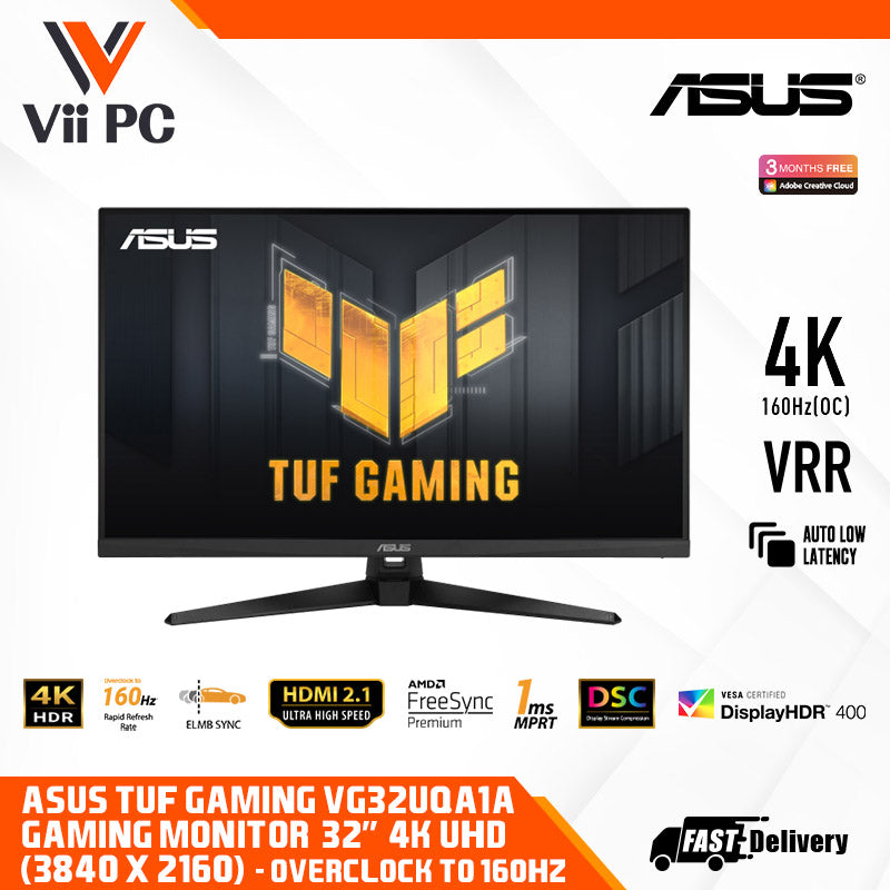 The 31.5-inch TUF Gaming VG32UQA1A 4K UHD gaming monitor featuring a blistering-fast overclock 160 Hz refresh rate gaming. Its clever combination of Display Stream Compression (DSC), ASUS Extreme Low Motion Blur Sync (ELMB Sync) and AMD FreeSync™ Premium technologies enables buttery-smooth gaming on PCs. Console gamers can get their fix, too, as TUF Gaming VG32UQA1A supports up to 4K 120 Hz visuals via HDMI® 2.1 without chroma subsampling. In addition, it meets DisplayHDR™ 400 compliance standards and has a 120% sRGB gamut to offer exceptional colors and contrast.