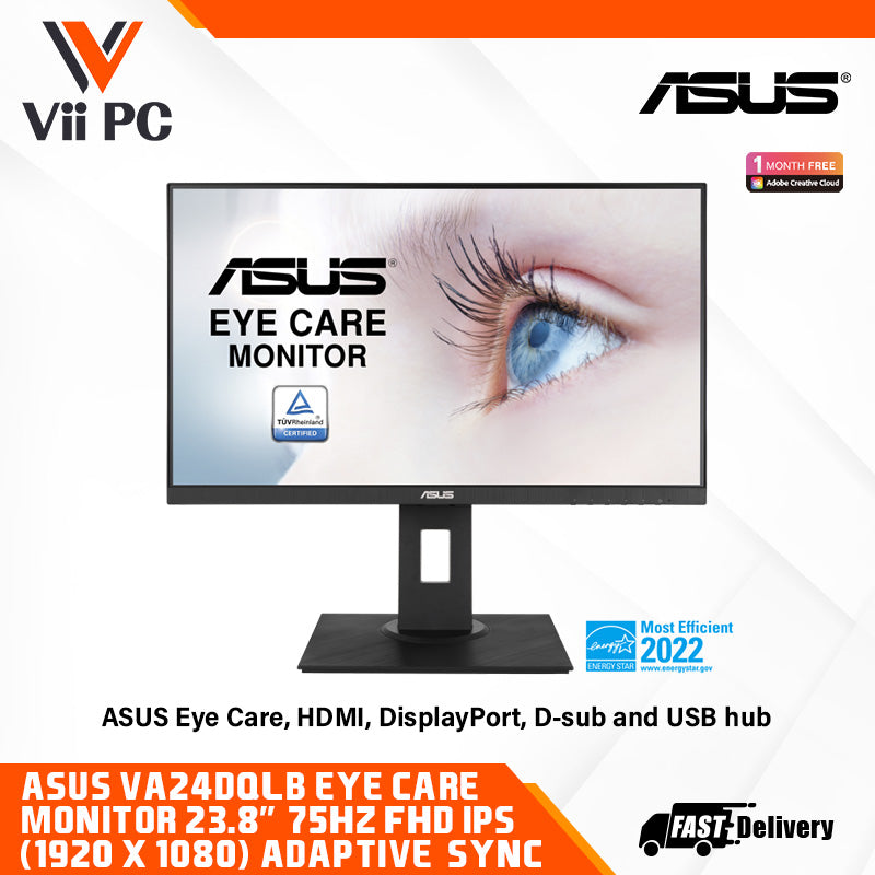 ASUS VA24DQLB Eye Care Monitor features 23.8 inch IPS panel with Full HD (1920 x 1080) resolution, providing 178° wide viewing angle panel and vivid image quality. Up to 75Hz refresh rate with Adaptive-Sync technology to eliminate tracing and ensure crisp and clear video playback. In addition, it also features TÜV Rheinland-certified Flicker-free and Low Blue Light technologies to ensure a comfortable viewing experience.