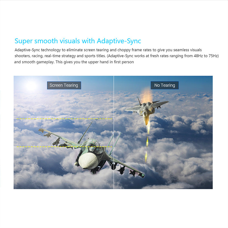 Adaptive-Sync technology to eliminate screen tearing and choppy frame rates to give you seamless visuals and smooth gameplay. This gives you the upper hand in first person shooters, racing, real-time strategy and sports titles. (Adaptive-Sync works at fresh rates ranging from 48Hz to 75Hz)