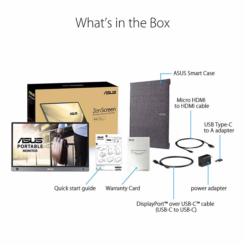 ASUS ZenScreen™ MB16AH is designed to keep you productive, wherever you are. USB-C™ and microHDMI connectivity enables displaying content from a wide-range of portable devices, so you can enjoy an expansive view for the best work and entertainment experiences.