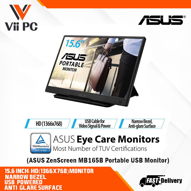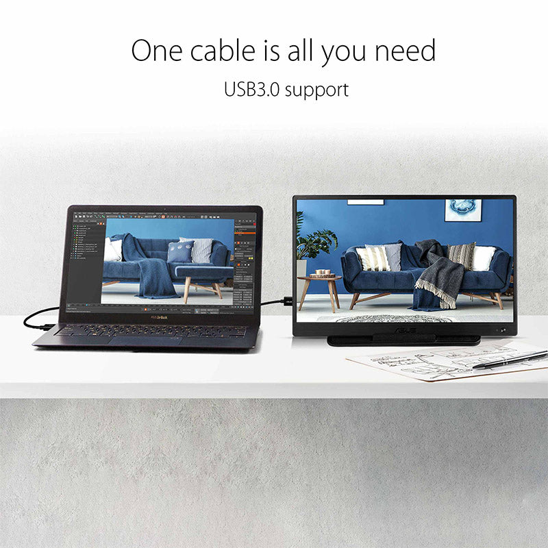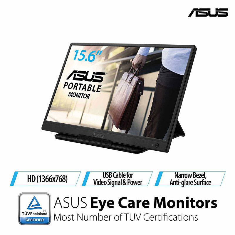 ZenScreen™ MB165B portable USB-powered monitor needs just one USB cable for both its video signal* and power, to be fully compatible with almost any laptop.