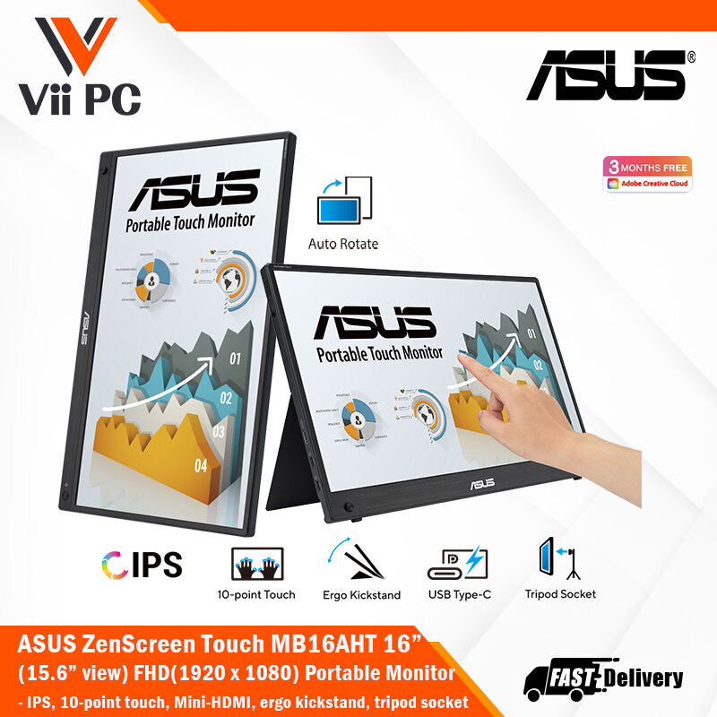 ASUS ZenScreen Touch MB16AHT is a 15.6-inch IPS FHD portable monitor with responsive and intuitive 10-point touch functionality* that allows users to swipe, scroll, drag and pinch gestures to help you get tasks done more efficiently. Dual USB-C™ and mini-HDMI connectivity enables displaying content from a wide-range of devices, so you can enjoy an expansive view for the best work and entertainment experiences, wherever you go.