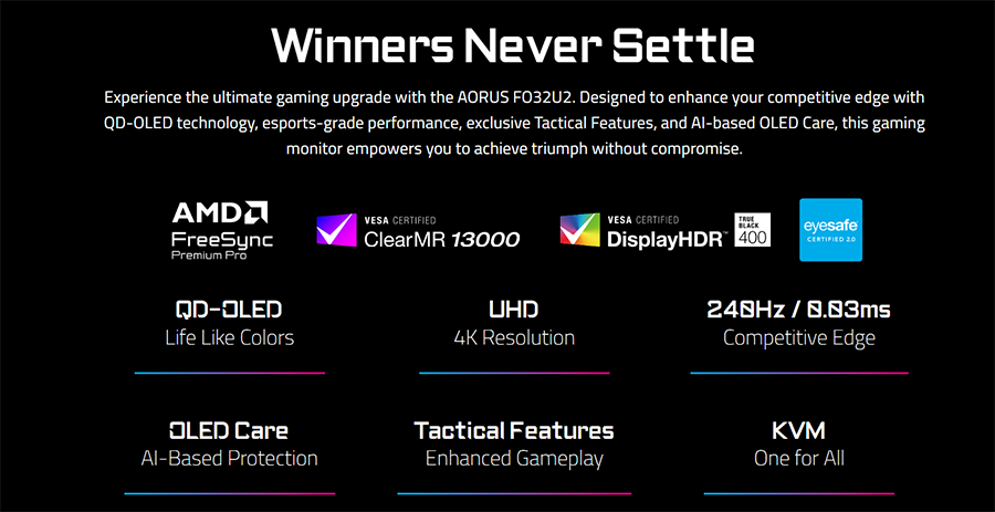 AORUS uses AI-based algorithm to minimize the risks of burn-in issues and deploys it across a suite of OLED protecting technologies on the AORUS FO32U2 with minimal interference.