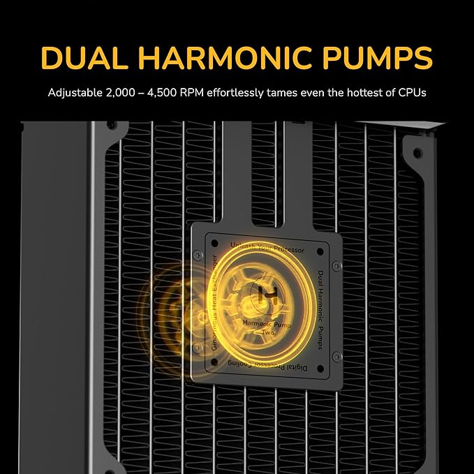 - Dual Harmonic Pumps: Adjustable 2,000 - 4,500 RPM circulate liquid with silenced acoustics and groundbreaking efficiency, effortlessly taming even the hottest of CPUs