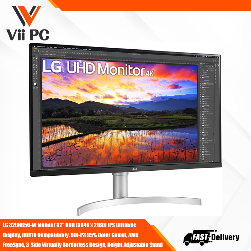 LG 32UN650-W Monitor 32" UHD (3840 x 2160) IPS Ultrafine Display, HDR10 Compatibility, DCI-P3 95% Color Gamut, AMD FreeSync, 3-Side Virtually Borderless Design, Height Adjustable Stand