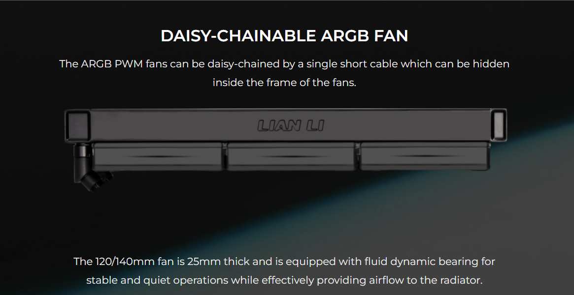 - Factory installed ARGB daisy-chainable radiator fans or UNI FAN SL-INF