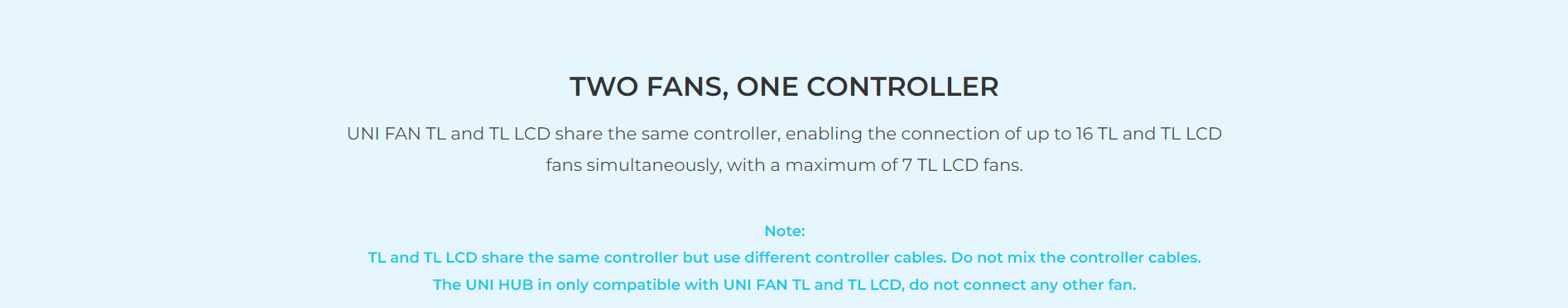 UNI FAN TL and TL LCD share the same controller, enabling the connection of up to 16 TL and TL LCD fans simultaneously, with a maximum of 7 TL LCD fans.