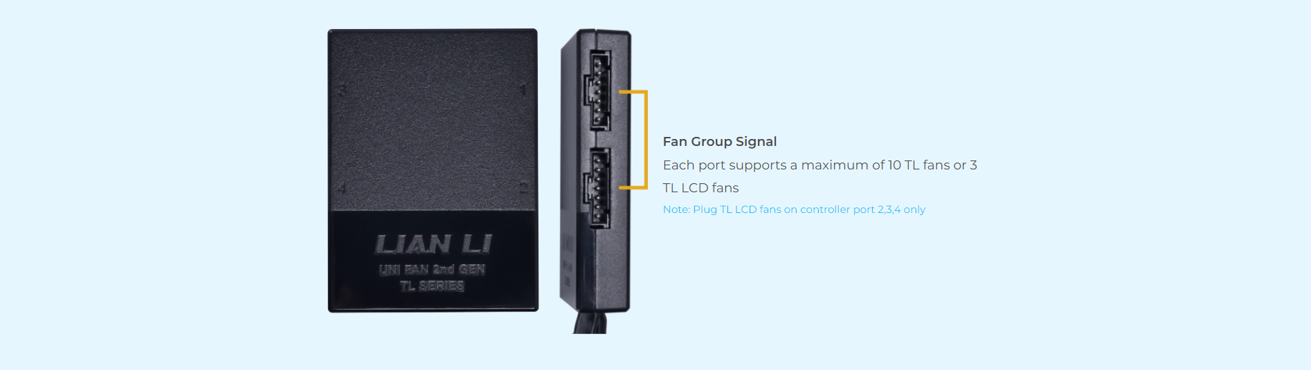 Each port supports a maximum of 10 TL fans or 3 TL LCD fans