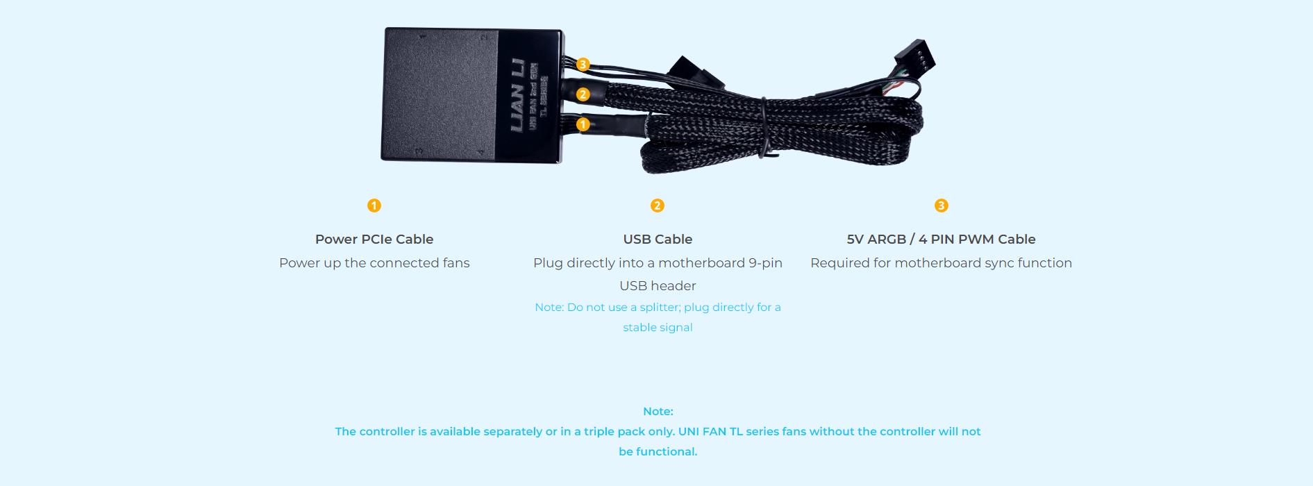 Note: The controller is available separately or in a triple pack only. UNI FAN TL series fans without the controller will not be functional.