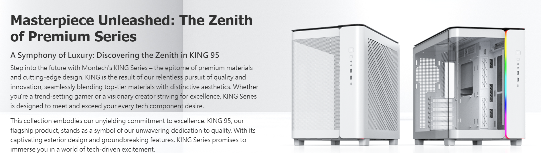 Step into the future with Montech's KING Series – the epitome of premium materials and cutting-edge design. KING is the result of our relentless pursuit of quality and innovation, seamlessly blending top-tier materials with distinctive aesthetics. Whether you're a trend-setting gamer or a visionary creator striving for excellence, KING Series is designed to meet and exceed your every tech component desire.