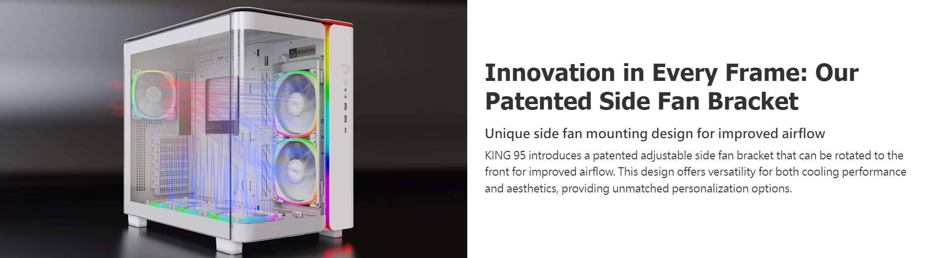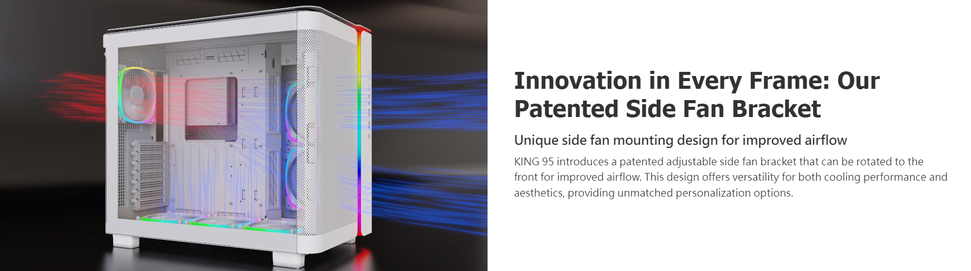 KING 95 introduces a patented adjustable side fan bracket that can be rotated to the front for improved airflow. This design offers versatility for both cooling performance and aesthetics, providing unmatched personalization options.