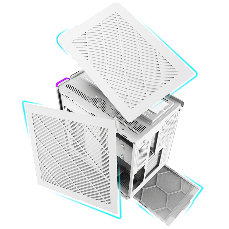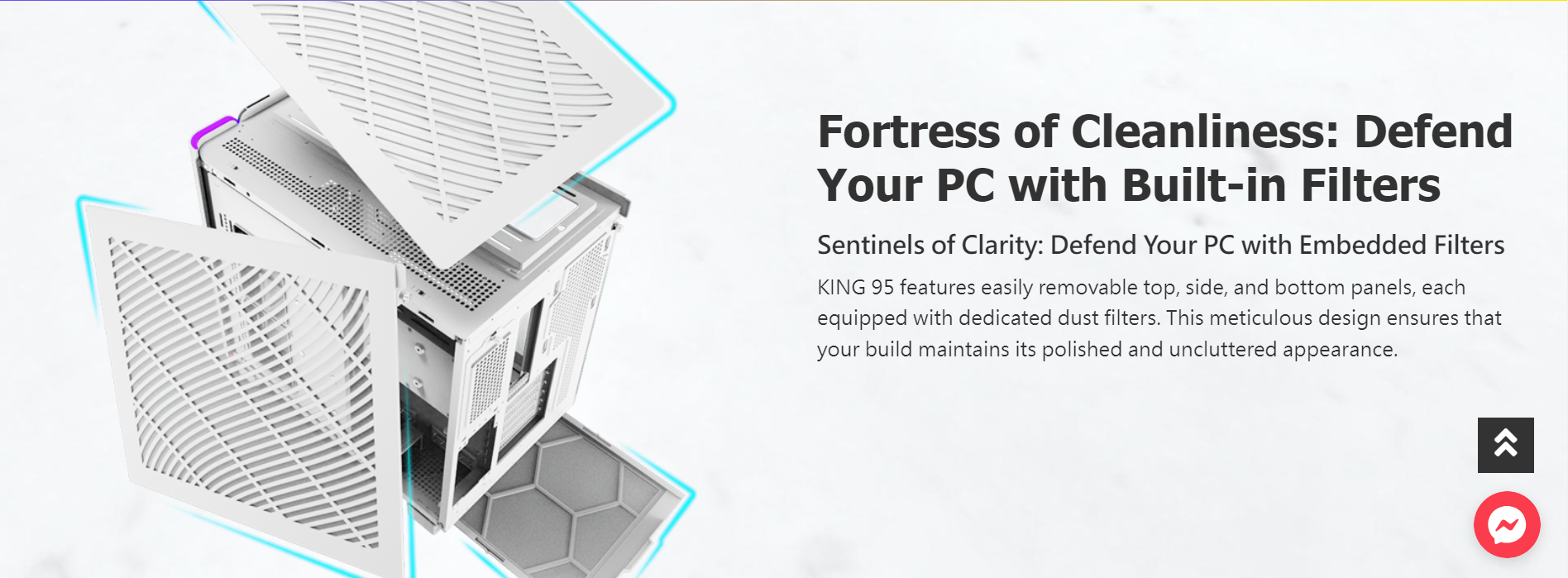 KING 95 features easily removable top, side, and bottom panels, each equipped with dedicated dust filters. This meticulous design ensures that your build maintains its polished and uncluttered appearance.