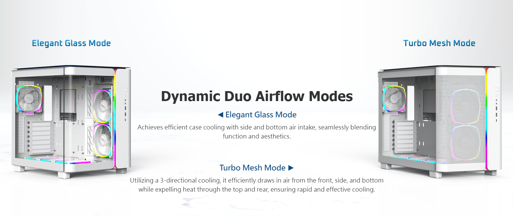 Elegant Glass Mode: Achieves efficient case cooling with side and bottom air intake, seamlessly blending function and aesthetics.