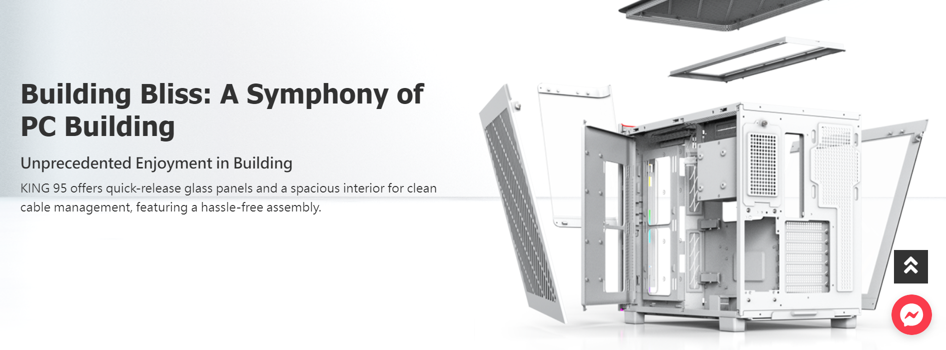 KING 95 offers quick-release glass panels and a spacious interior for clean cable management, featuring a hassle-free assembly.