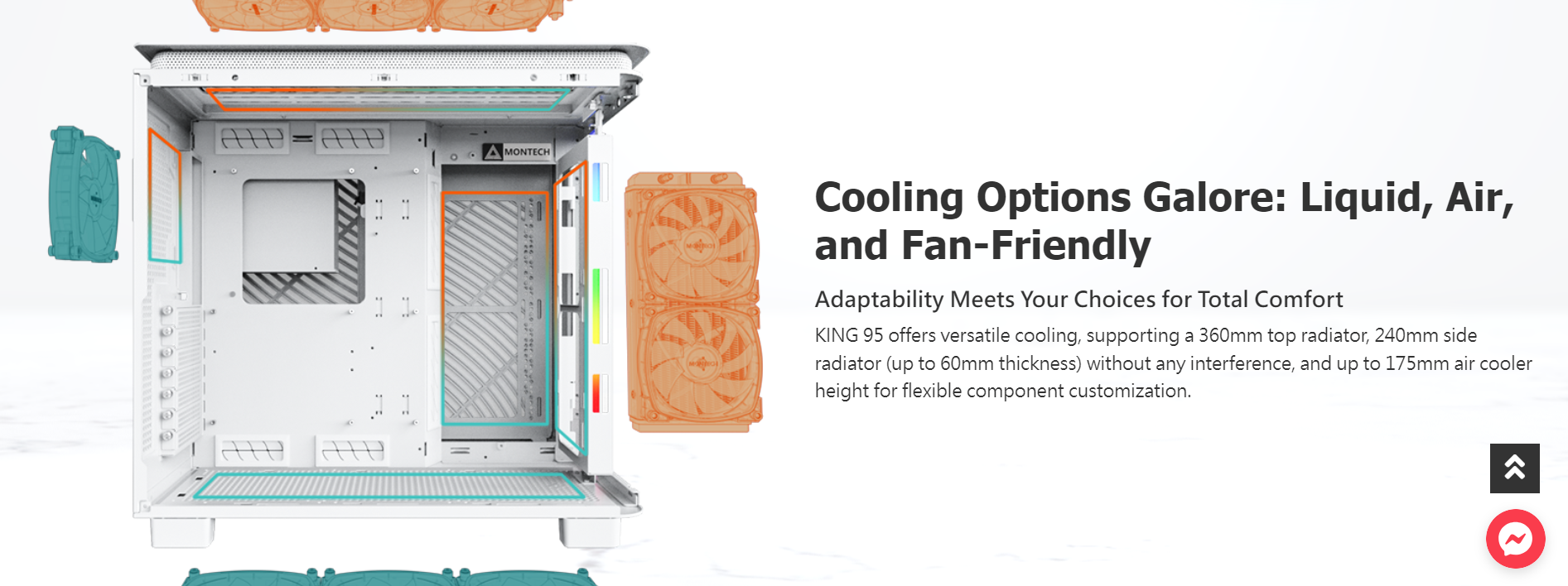 KING 95 offers versatile cooling, supporting a 360mm top radiator, 240mm side radiator (up to 60mm thickness) without any interference, and up to 175mm air cooler height for flexible component customization.