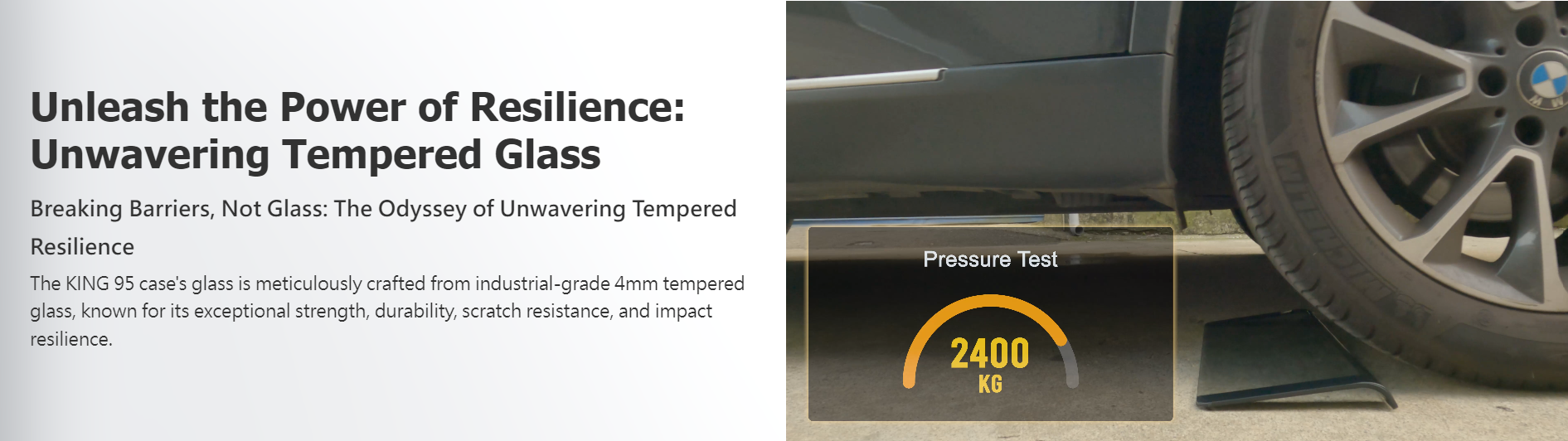 The KING 95 case's glass is meticulously crafted from industrial-grade 4mm tempered glass, known for its exceptional strength, durability, scratch resistance, and impact resilience.