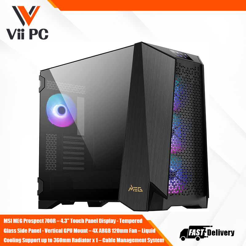 MSI MEG Prospect 700R E-ATX Mid-Tower Gaming Chasis - 4.3" Touch Panel Display, Tempered Glass Side Panel, Vertical GPU Mount, 4X ARGB 120mm Fan, Liquid Cooling Support up to 360mm Radiator x 1, Cable Management System