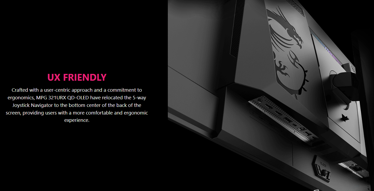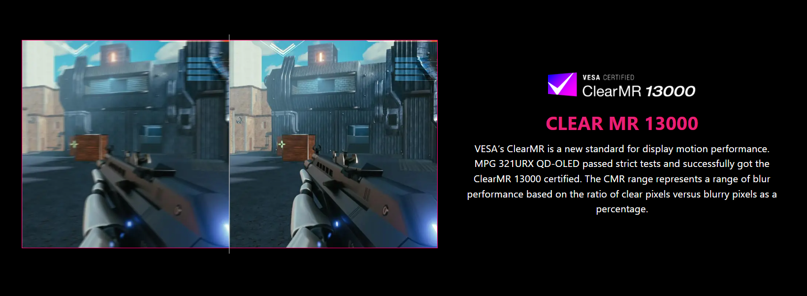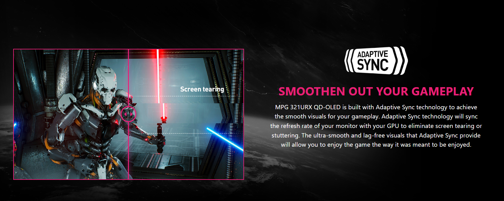 Visualize your victory with the MPG 321URX QD-OLED gaming monitor. It boasts a 3840x2160(UHD) next-gen QD-OLED panel, 240Hz refresh rate, and rapid 0.03ms(GtG) response time. VESA certification for ClearMR 13000 and DisplayHDR True Black 400 ensures exceptionally vivid images and mitigates motion blur. OLED Care 2.0 reduces OLED burn-in risks. For console gamers, the MPG 321URX QD-OLED provide HDMI 2.1 ports with 48Gbps bandwidth, 120Hz support, VRR, and ALLM.