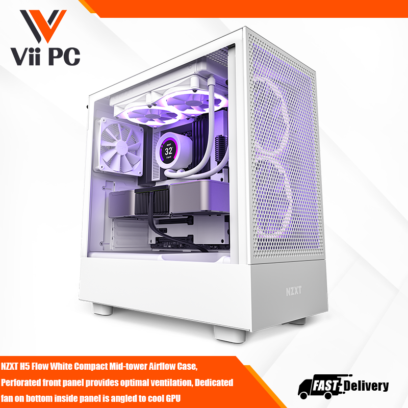 NZXT H5 Flow White Compact Mid-tower Airflow Case, Perforated front panel provides optimal ventilation, Dedicated fan on bottom inside panel is angled to cool GPU