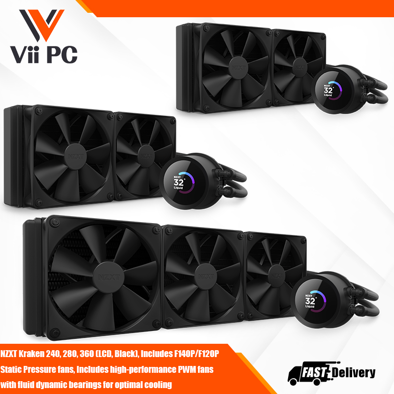 NZXT Kraken 240, 280, 360 (LCD, Black), Includes F140P/F120P Static Pressure fans, Includes high-performance PWM fans with fluid dynamic bearings for optimal cooling