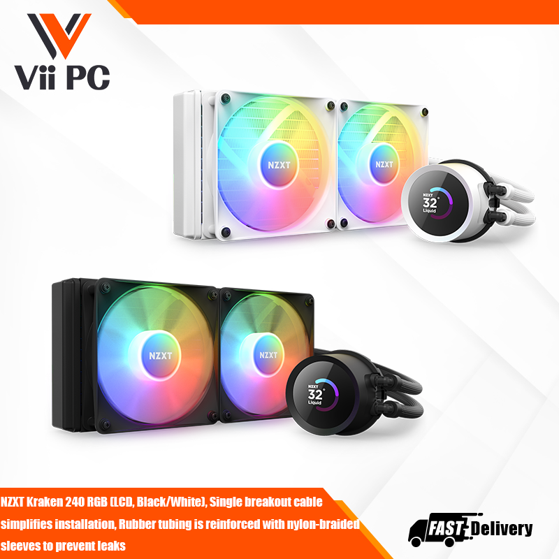 NZXT Kraken 240 RGB (LCD, Black/White), Single breakout cable simplifies installation, Rubber tubing is reinforced with nylon-braided sleeves to prevent leaks