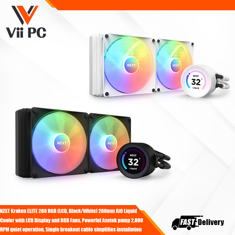NZXT Kraken ELITE 280 RGB (LCD, Black/White) 280mm AIO Liquid Cooler with LCD Display and RGB Fans, Powerful Asetek pump provides optimal cooling and up to 2,800 RPM quiet operation, Single breakout cable simplifies installation