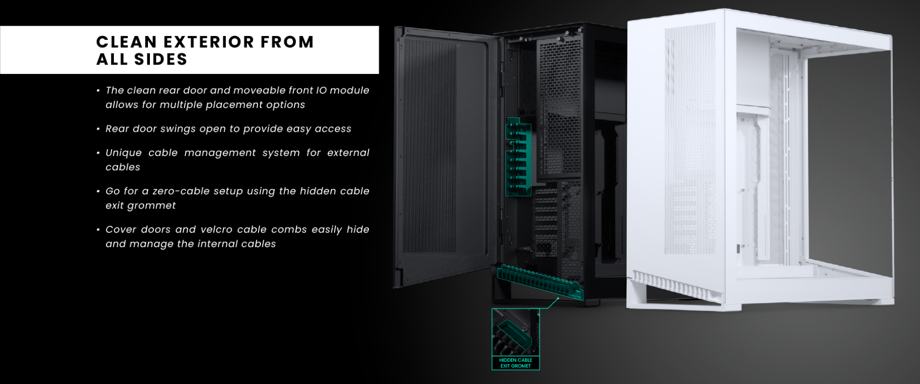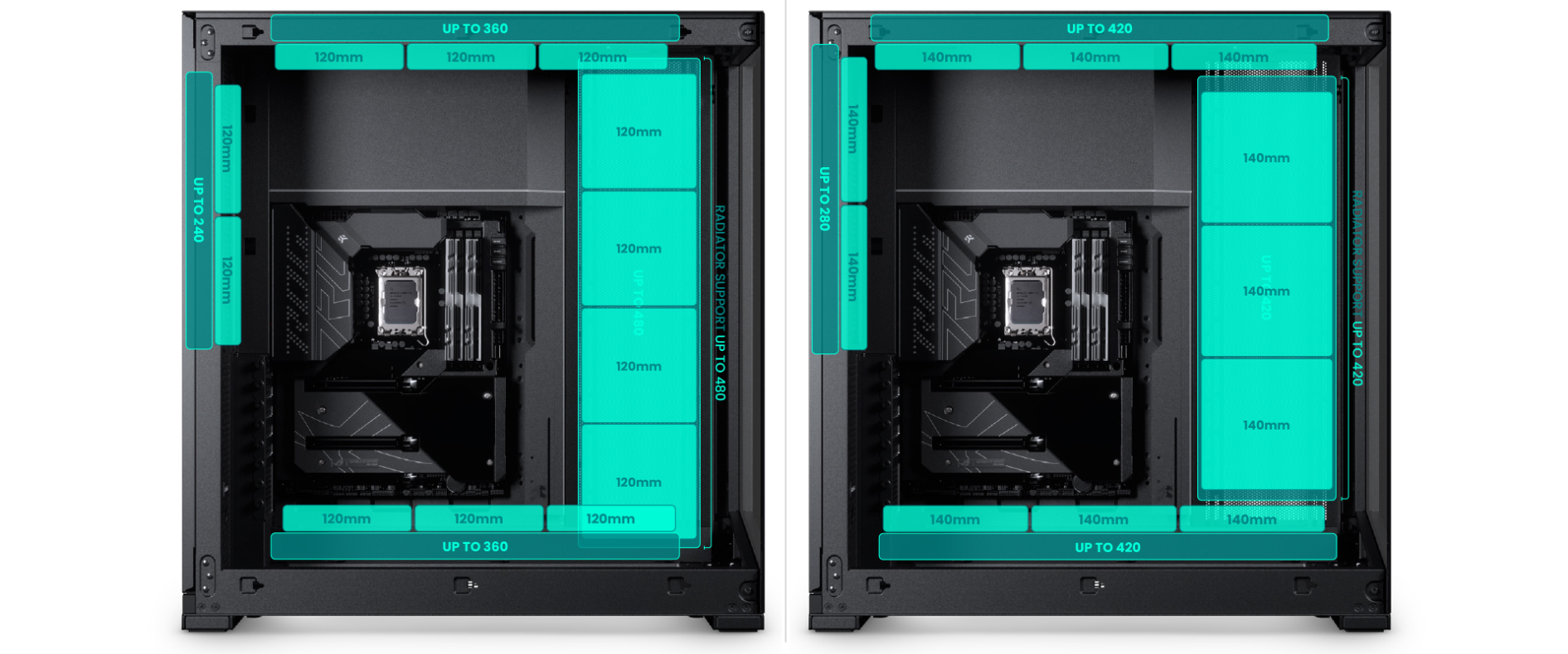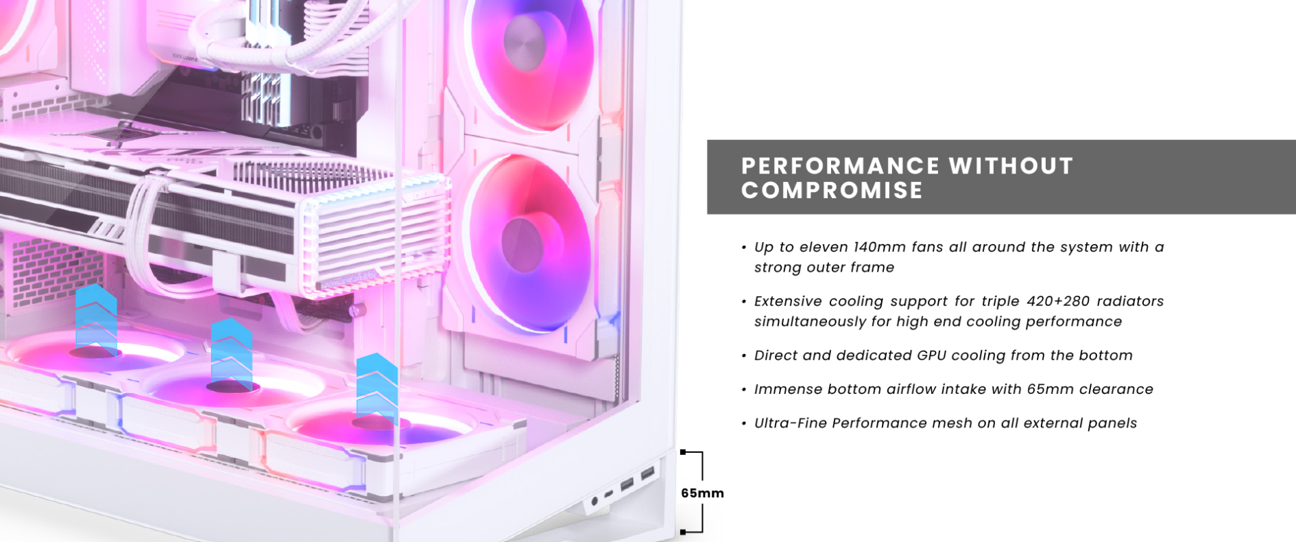 Ultra-fine Performance mesh on exterior panels. Immense bottom airflow intake with 65mm clearance. Direct and dedicated GPU cooling from the bottom. Extensive cooling support for triple 420+280 radiators simultaneously for high end cooling performance.
