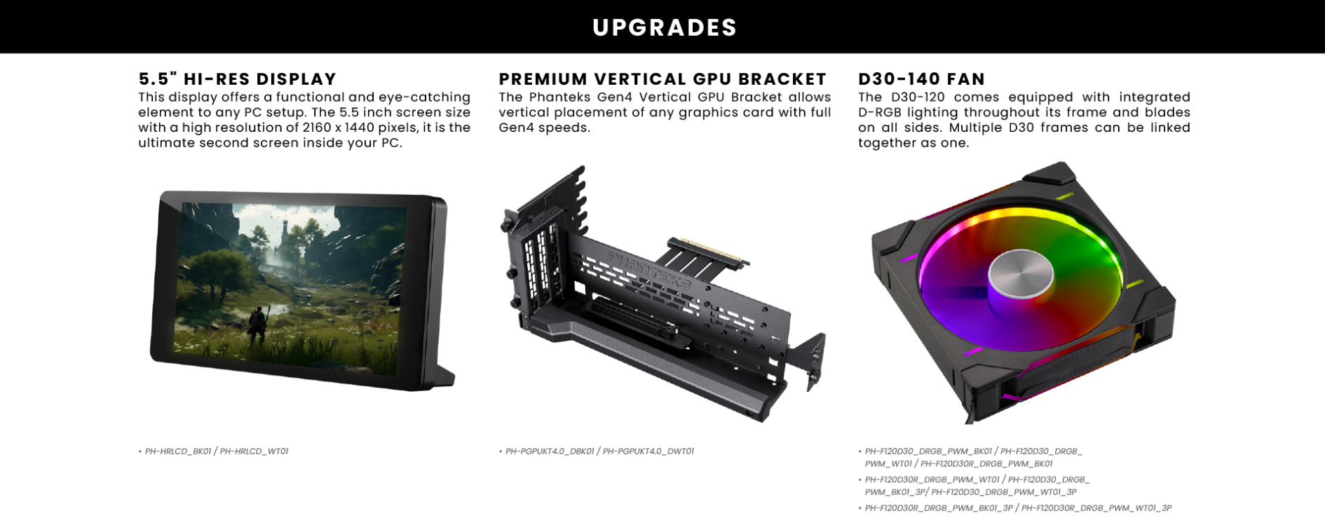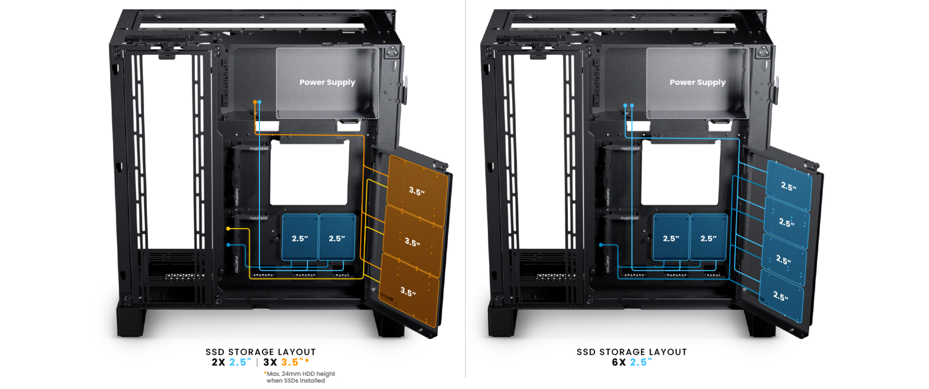 Versatile GPU support bracket securely holds GPU to motherboard and prevents sag. Removable side and bottom fan bracket for easy installation. Bottom bracket can be reversed for angled or horizontal position.