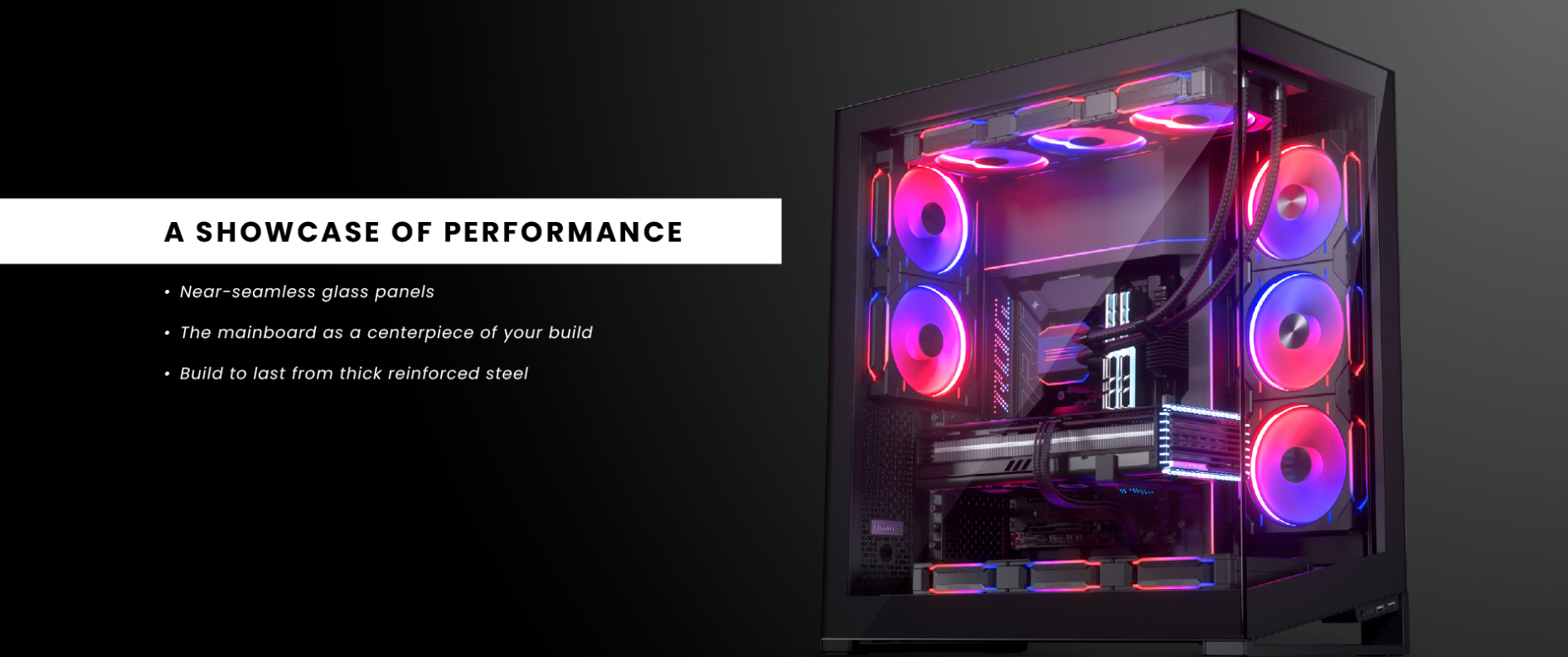 Near-seamless glass panels for a perfect view of all your system components. Unique layout with the motherboard at the center and fans all around it.
