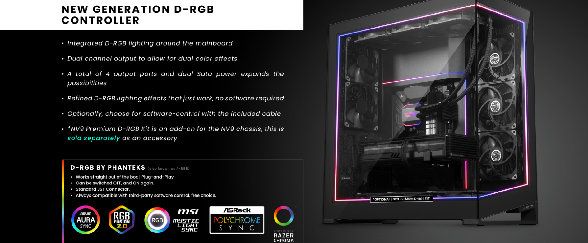 The Phanteks NV9 is a full-tower chassis, featuring a stunning near-seamless glass view and support for eleven 140mm fans and triple 420+280 radiators simultaneously . Following the same unmistakable purpose design of the NV7, it highlights the system components with the motherboard at its center . Combined with a strong and defining outer frame it captures and accentuates the hardware components . With a clean design from all sides, the NV9 allows you to place your system freely without the traditionally messy rear side . The glass panels offer a near-seamless view of the inside to further focus on the system components .